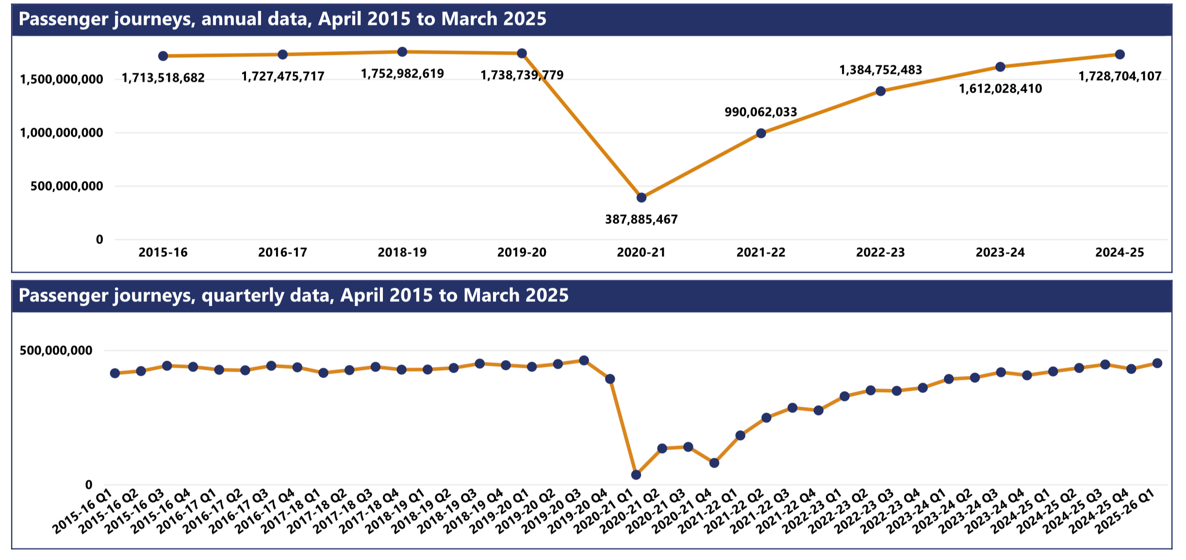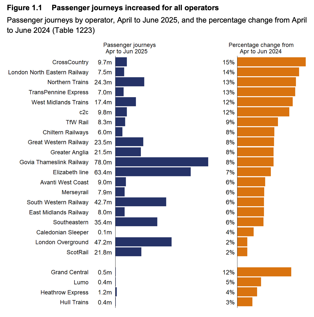 A total of 451 million journeys were made by rail passengers in Great Britain in the latest quarter (April to June 2025). This is a 7% increase on the 420 million journeys in the same quarter in the previous year (April to June 2024).
