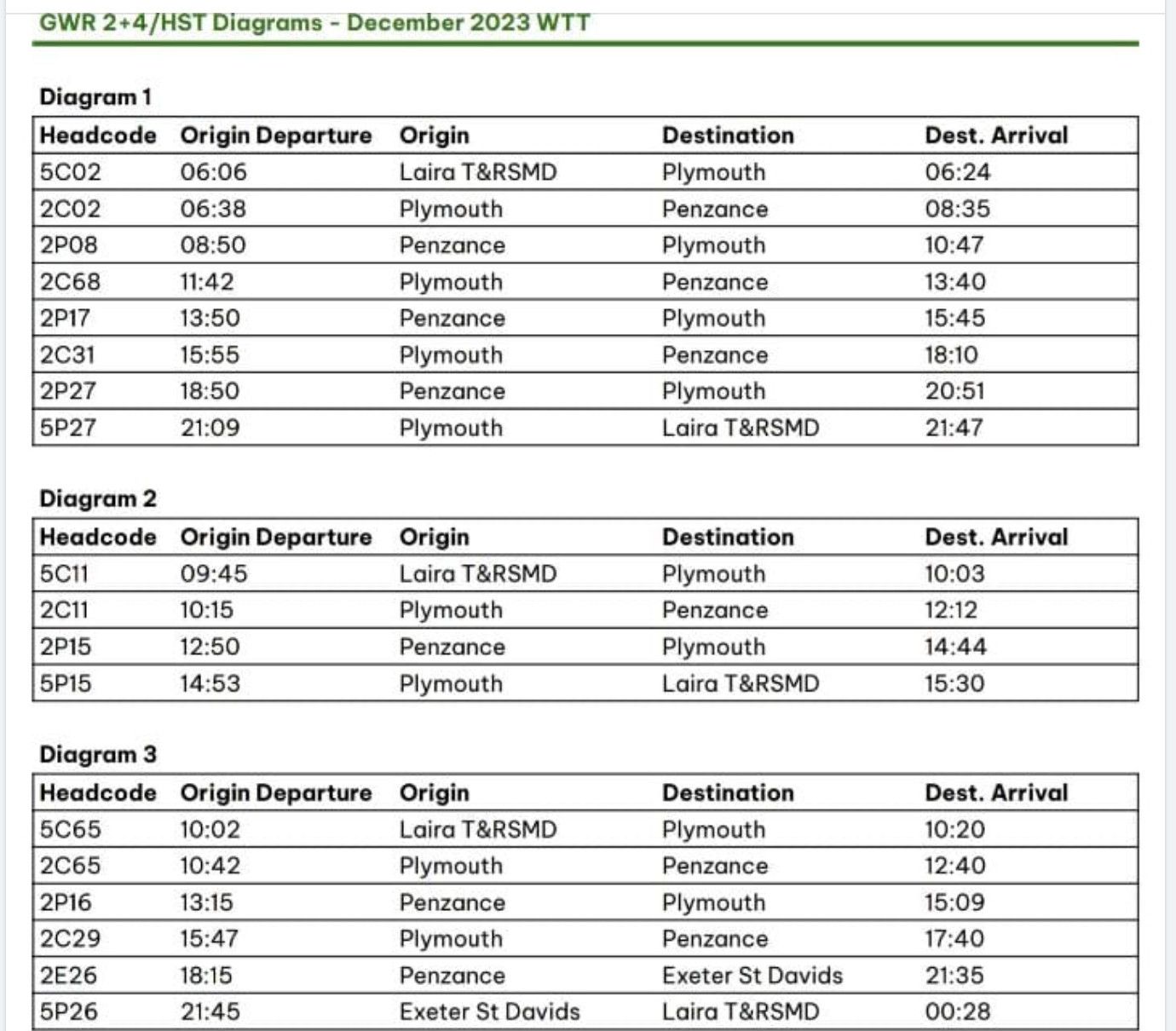 For early 2024 - there will be three Castle Class diagrams per day remaining, on local journeys between Plymouth and Penzance, with one journey per day as far east as Exeter. This change is being made to allow crew competency to be retained amongst a reducing number of drivers, and to keep the elderly trains near the depot at Laira where they will be retained. Some Cardiff to Penzance services will be spilt, with an IET at the Wales end and an HST in Cornwall.